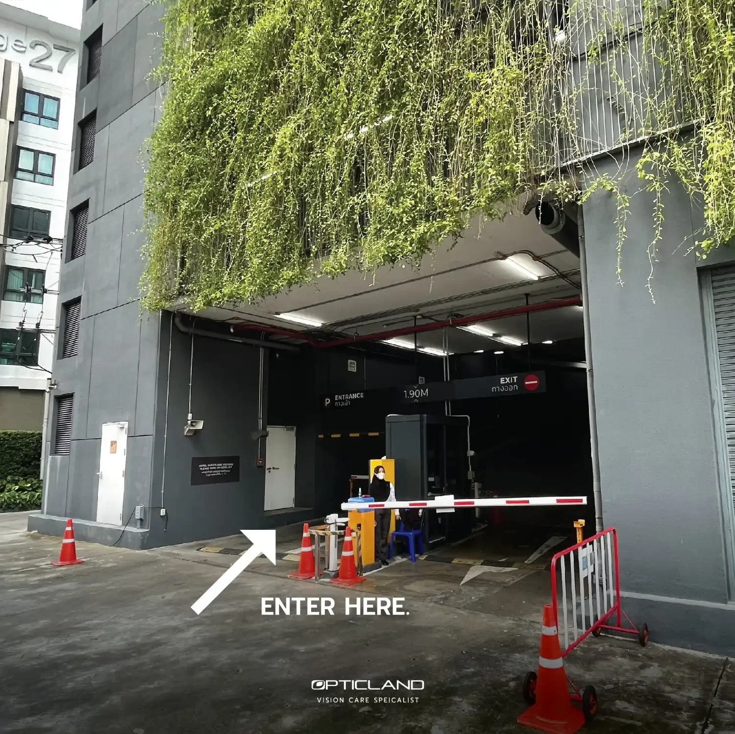 เข้าทางขึ้นอาคารจอดรถ แจ้งพนักงานว่า "มาร้านแว่นตา OPTICLAND" จากนั้น พนักงานจะมอบบัตรจอดรถให้กับลูกค้า *ลูกค้าจะต้องมารับตั๋วจอดรถจากทางร้าน OPTICLAND และนำไปสแตมป์บัตรที่ LOBBY ของโรงแรม
